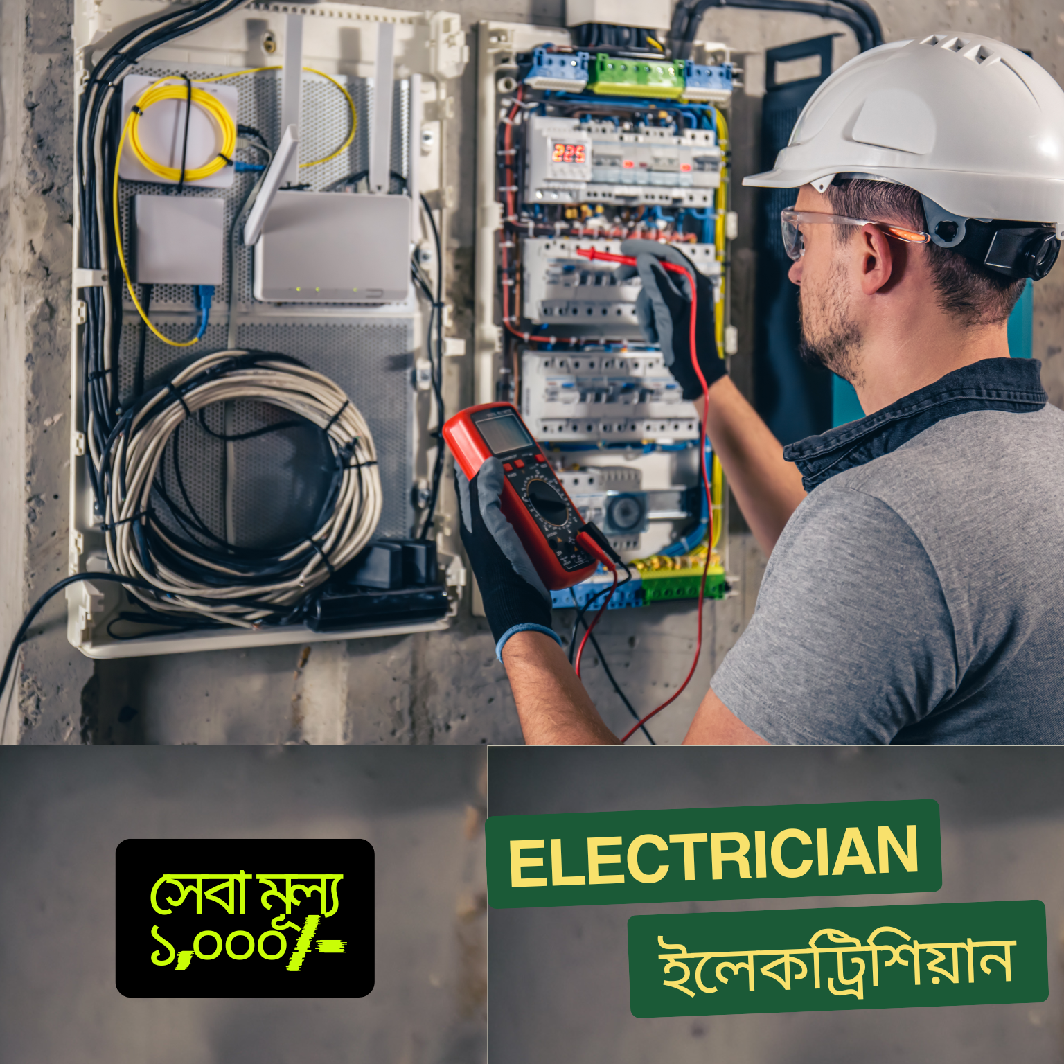 - ওয়্যারিং ও তারের কাজ: নতুন ওয়্যারিং স্থাপন, পুরোনো ওয়্যারিং পরিবর্তন এবং ত্রুটিপূর্ণ তার মেরামত।